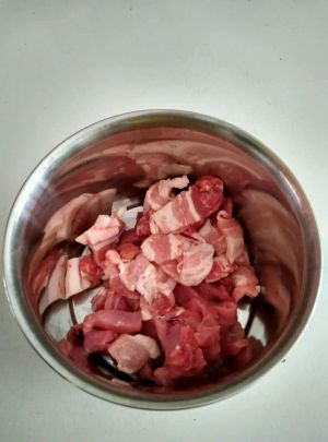 瘦肉和五花肉切好放盘里面,洗的时候最后沥干水
