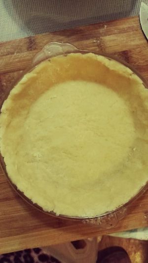 将面团等分为两份,取出其中一份擀成圆形,并放入派盘中,没有的可用一般的盘子代替,铺满后裁掉多余的边
