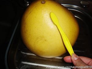 把柚子涂抹上一层盐刷净干净;削下柚子皮,这是柚子祛痰镇咳的精髓所在。