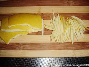 剥出柚子肉撕成小块;削下的黄皮切成大约3厘米长、粗细1毫米左右的细丝,越细越好。