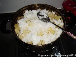 把处理好的柚子皮和果肉放入干净无油的锅中,加一小碗清水和冰糖,用中小火熬1个小时,熬至黏稠,柚皮金黄透亮即就可以了,注意熬的时候要经常搅拌,以免粘锅。