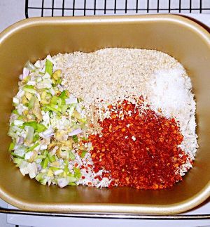 将肉丝放入面包桶内,加入葱、姜、蒜、糖、盐、玉米油、生抽、老抽、料酒、辣椒粉、花椒粉、五香粉、白芝麻。