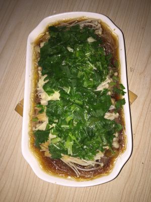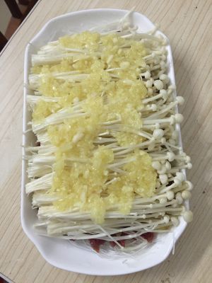 金针菇洗干净铺在牛肉上面,然后再铺上搅拌好油盐的蒜蓉。