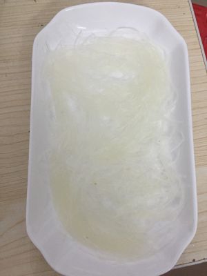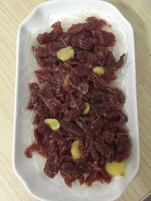 牛肉切好,加油盐和一点点生粉和一点点生姜片腌好铺在粉丝上面
