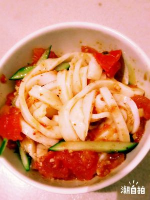 6:将切好的面皮放入碗里,给西红柿汁里倒入适量醋,再将西红柿汁倒入面皮中,加上点黄瓜条,搅拌即可。