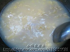 锅内烧开水,调小火,将面糊依着锅边轻轻倒入,成形后用勺轻搅锅底避免糊锅
