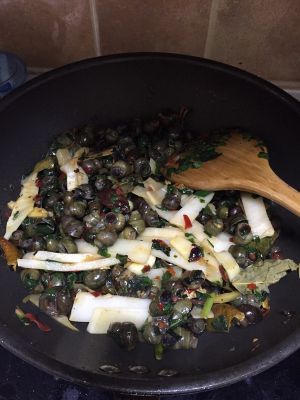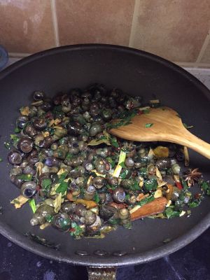 锅内放油,将葱姜蒜炒香。然后下香料继续炒香,两勺豆瓣酱炒出红油,然后下田螺一起翻炒,倒入点白酒,一小勺糖,闷一小会,香气四溢之后,下酸笋继续翻炒