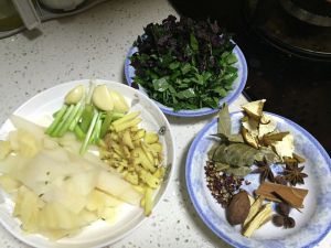 酸笋切条,葱姜蒜切好,沙姜紫苏假蒌切好,香料备好
