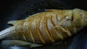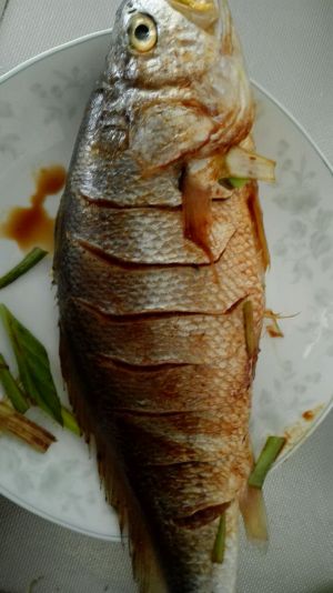 黄花鱼一条去鳞和内脏,然后在鱼身两侧各划几刀,抹上盐和料酒,撒上葱花姜丝腌一小时。也可以给鱼做个按摩。