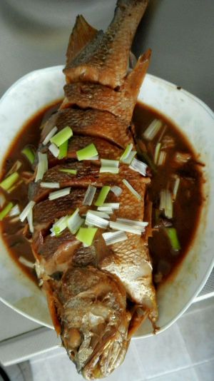 收汁时稍微留一点汤汁,把鱼盛入盘中,把汤汁浇鱼身上,再撒点葱花,淋点香油。
