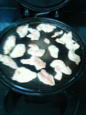 平底锅抹少许油,将一片片鸡胸肉平码着煎制,翻个面继续