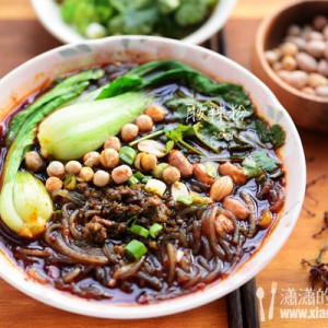 放上碎米芽菜、熟花生米、炸豌豆、香葱末、香菜末,即可食用。