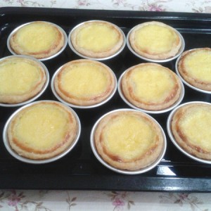 将烤箱预热到上下210度,用勺子将蛋挞水盛到捏好的挞皮里,装7分满就行,全部装好放烤箱中层,烤20分钟就可以出炉了。