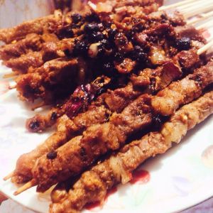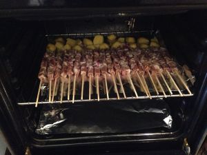烤箱加热后,放羊肉串。五成熟时加盐,七成加辣椒,再烤一会加孜然。时间视不同烤箱而定。要翻面,我佐料加了两三遍,常盯着,看个人口味,试着吃觉得OK了就可以拿出来了。