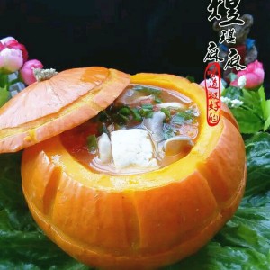 蒸好的南瓜盅撒点葱花,滴几滴香油,就可以开吃啦!