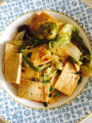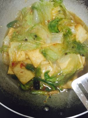 放入清水烧开,加入煎好的豆腐、生菜,放入盐、味精、五香粉煮。