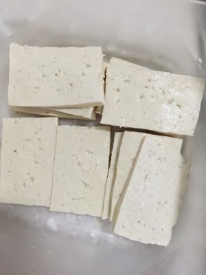 平底锅放少油煎豆腐,煎至两面黄捞起备用