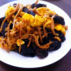 黄花菜和黑木耳分别泡发摘洗干净。鸡蛋打散炒熟备用。