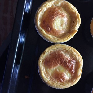 4、上步骤进行的同时将11个蛋挞皮从冷冻室内拿出来稍微解冻,180度预热烤箱。接着把蛋挞液徐徐倒入蛋挞皮里,量约2/3。