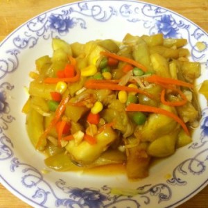 茄子去皮切条,放入有盖玻璃碗中,微波加热,一直到茄子软了为止
