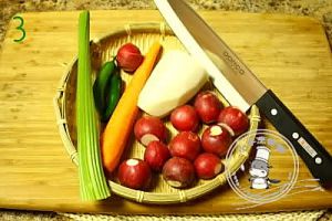 樱桃萝卜、白萝卜、胡萝卜、西芹、青辣椒用清水洗净,晾干或用厨房纸巾擦干表面所有水份;