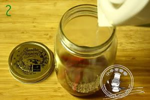 取一耐热、无水、无油、干爽的玻璃瓶,放入上述材料,冲入少量开水,摇晃浸泡直水凉;