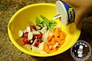 将切好的蔬菜块,放入无油的中号彩色色拉盆,加入适量的无碘盐,兜匀腌制20分钟左右,用凉白开冲洗掉盐份,稍稍沥干水份;