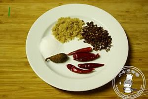 无碘盐、红糖各2大勺(1大勺=10ml)、适量花椒、干红椒、草果、香叶(忘拍图)备齐;