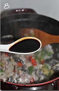 加入一汤匙半老抽、蚕豆大小体积的白糖和一点点盐,翻炒均匀。
