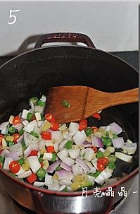 盖上盖子,转小火焖5分钟。(我这里用的珐琅锅,锁水功能好 ,所以不需要加水。如果用普通锅子,这步要稍微加点水焖)。