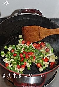 倒入青红椒圈、大蒜和姜,转中火煸香。