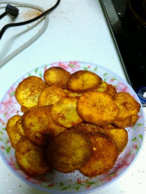 炸至金黄后捞出,放入容器,撒上辣椒面,完工!