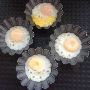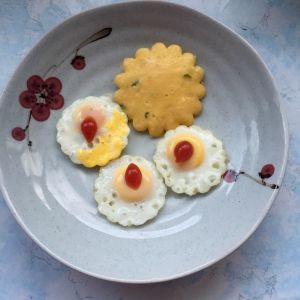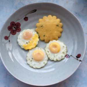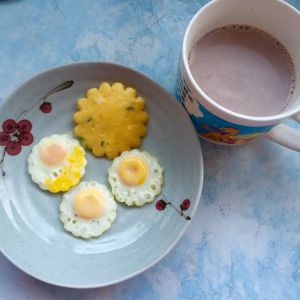 鹌鹑蛋直接夹出,蛋饼用磨具卡出花型,装盘