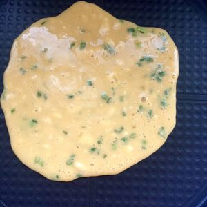 鸡蛋打散放面粉放一点盐放蒜苗丁搅匀,电饼档打开涮一点油,面糊倒入煎熟