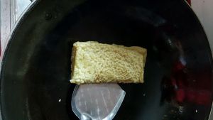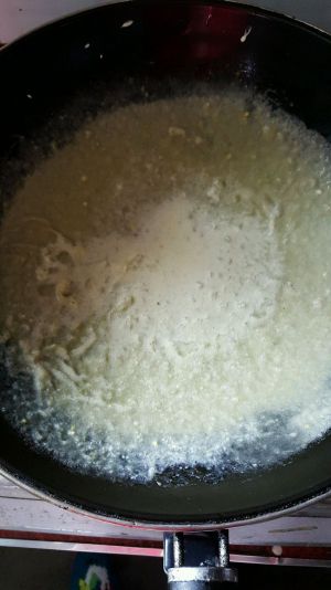 锅烧热,将一大勺糊均匀的摊到锅内,转动锅,让糊均匀的摊在锅内。
