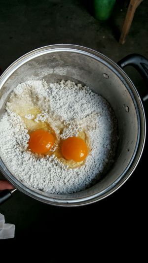 记得过程中将锅慢慢转动,使锅边的糊也受热均匀,等面糊于锅开始脱离,就可以把面糊向中间折起来。