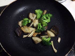 先煎配菜,要有耐心过程有点长,加盐、糖、鲍鱼汁或者一点耗油。