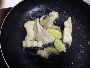 切几片姜和龙利鱼一起煎,加盐、黑胡椒粉。