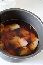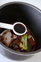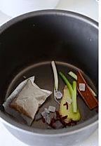 把葱、姜、香叶、桂皮、冰糖、辣椒丝和料包,放到电饭锅