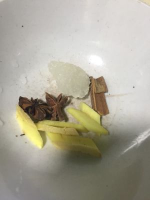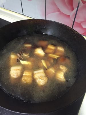 翻炒一下后,加入大量开水,没过肉为止!加入一勺料酒,若干生姜、茴香、桂皮、冰糖,大火煮开,改小火慢炖50分钟。
