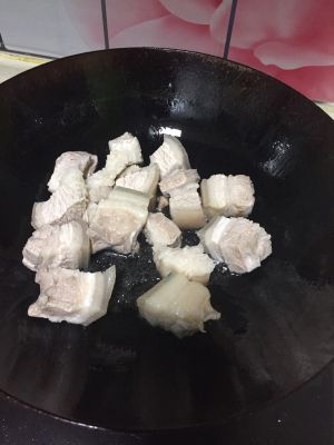 起油锅,放少量油,油温七八成热,下五花肉!翻炒!