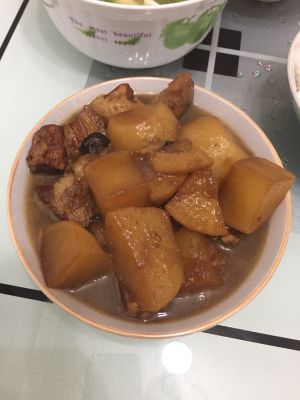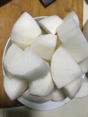 萝卜洗净,切成小块,放入锅内!继续小火炖30分钟!
