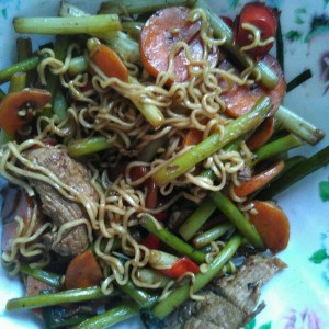 待蒜苔胡萝卜八成熟,放入已煮好的面,一起翻炒 即可出锅。颜色也很好看哦
