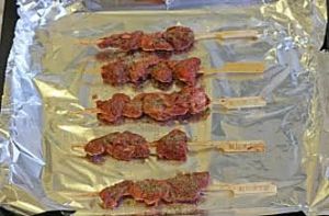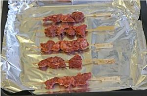 烤盘铺锡纸,将肉串整齐的码放在烤盘上。