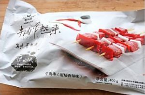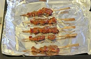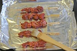 用毛刷沾少量色拉油均匀的刷在肉串表面。