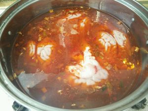 向炒香的调料中加入适量水,并将脑花儿放入,炖煮15至20分钟即可