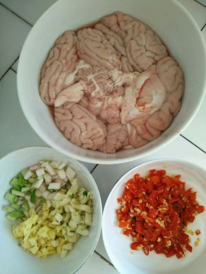 将脑花儿表面的膜去掉后洗净备用,葱头切段,姜、大蒜、泡椒分别切碎