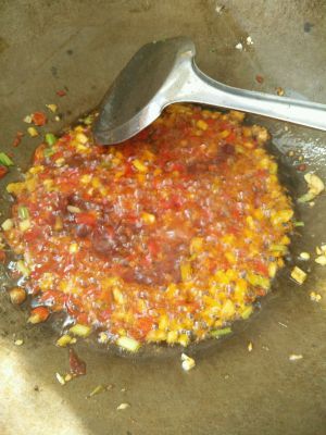 将准备好的葱段、姜、大蒜、泡椒分别放入油锅中煸炒,炒香后加入少量豆瓣继续煸炒