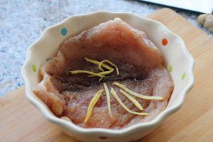 稍稍按摩一下鸡胸,放入姜丝,用保鲜膜将碗覆盖,腌制半小时