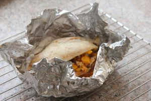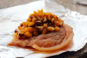 取出腌制好的鸡胸,放在锡纸上,将调味好的彩椒香菇丁放到鸡胸上